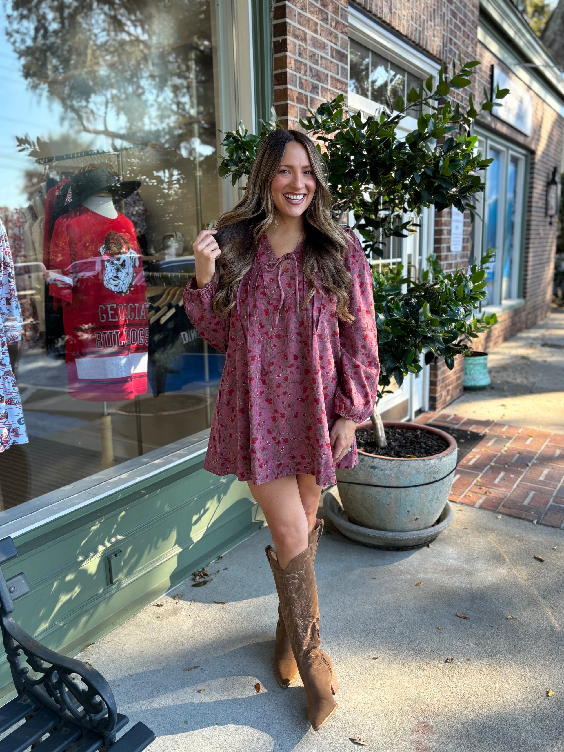 + Floral corduroy mini dress + V neckline with tying closure + Pin tuck detail on front and back + Long puff sleeves with elastic cuffs + Shift silhouette + Pockets +