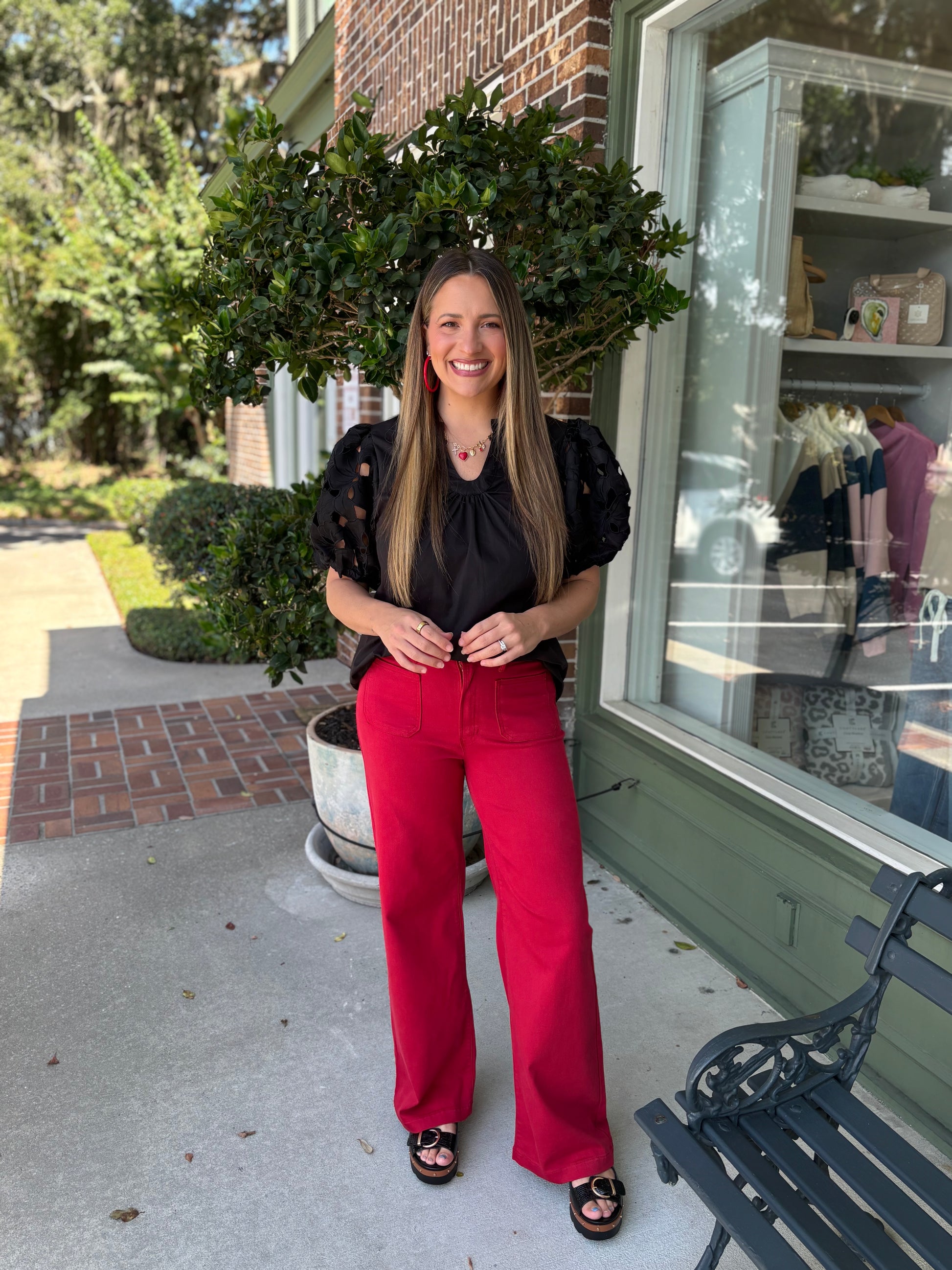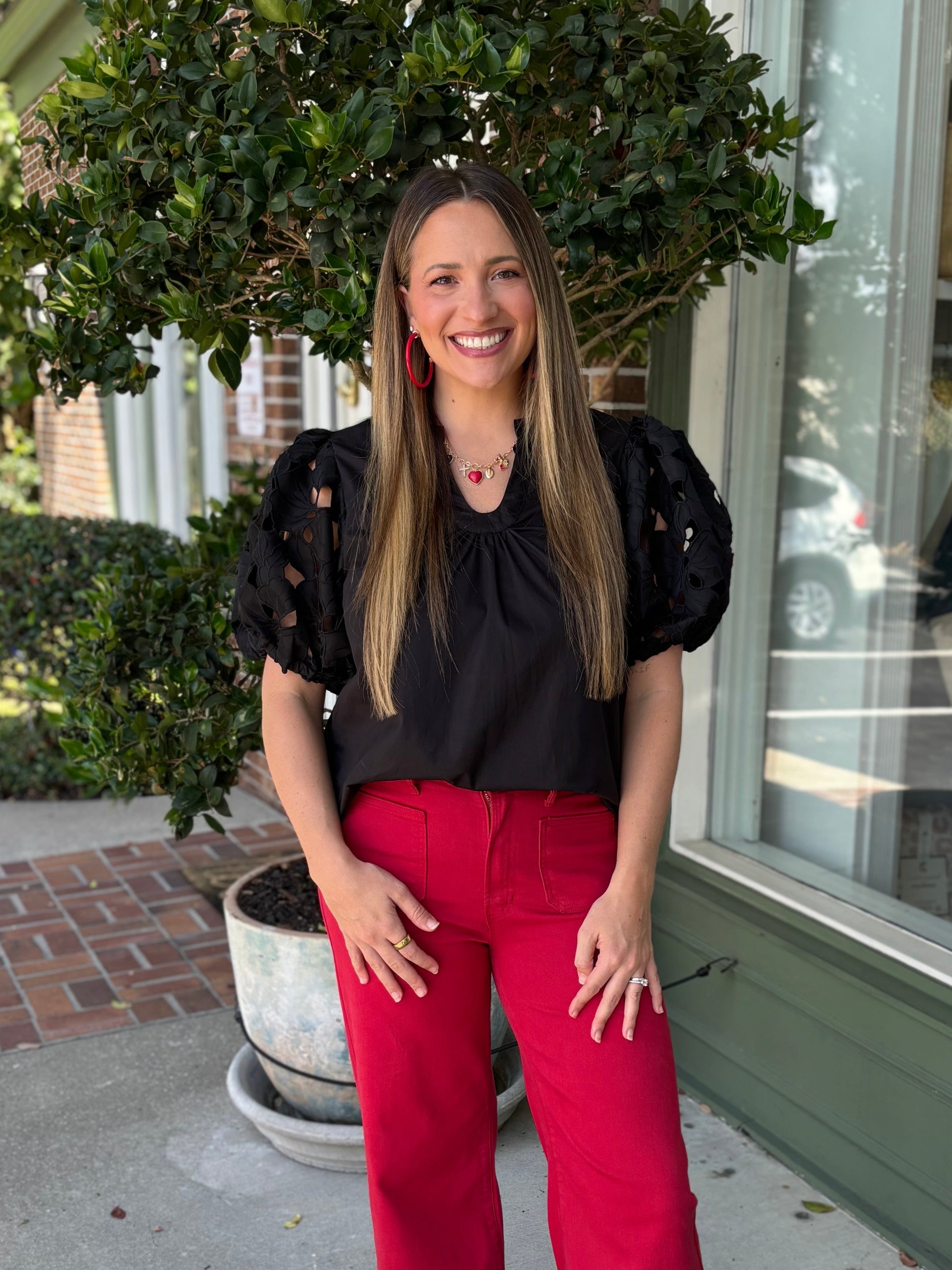 The Jacklyn Top - Black adds a playful twist with its eyelet sleeve detail, giving your outfit a breath of fresh, flirty style. Its unique sleeves create just the right peek of texture and charm, making it a fun choice for any casual outing or lively event. Stay cute and confident in this standout piece!