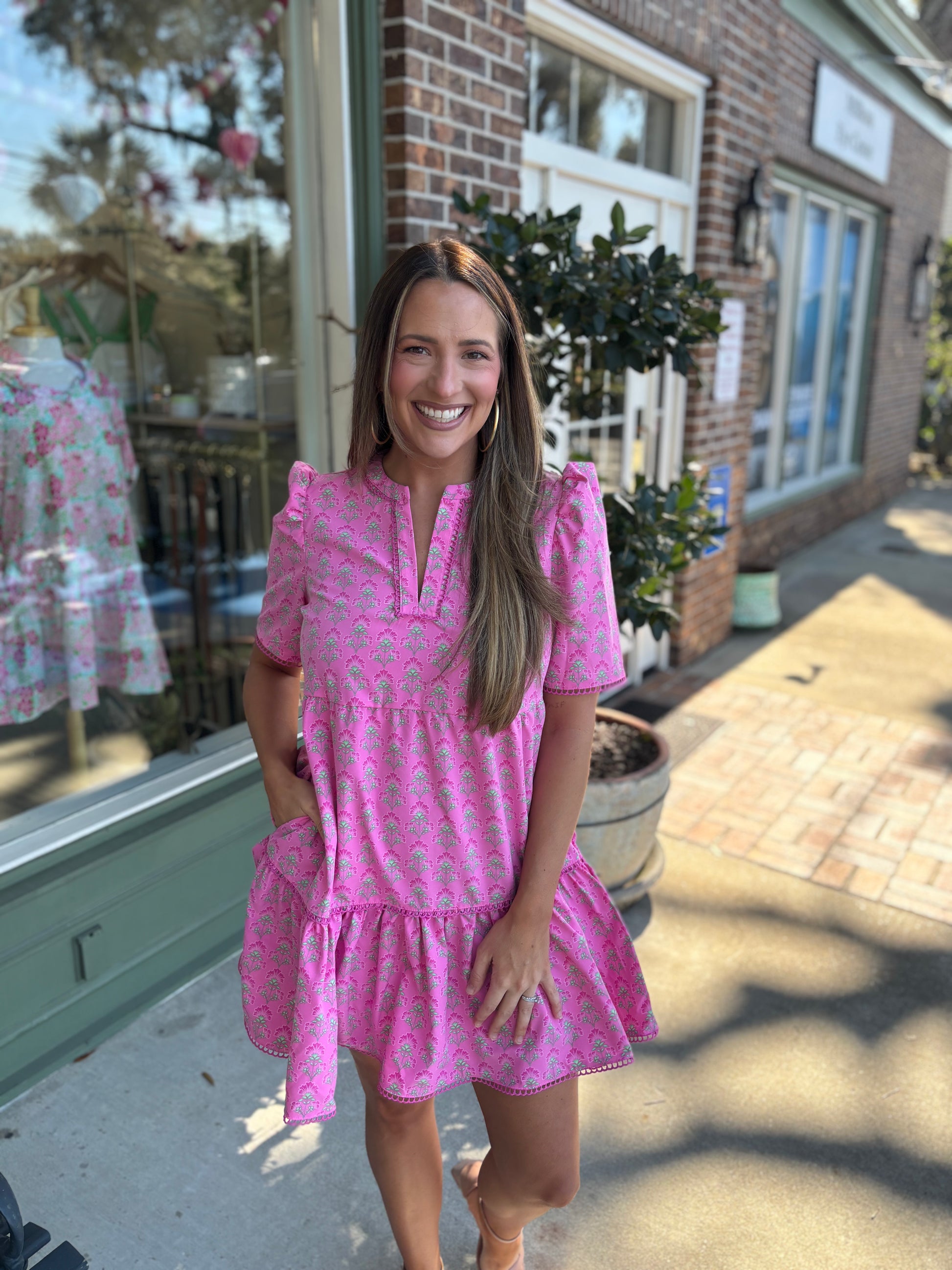 The Adelyn Dress is a timeless piece that combines playful details with everyday comfort. Featuring scallop trim accents for a delicate touch, a split neckline for a relaxed yet flattering fit, and short puff sleeves for a fun, airy feel, this dress is designed for effortless style. Practical pockets add functionality, making it perfect for casual outings or dressier occasions.