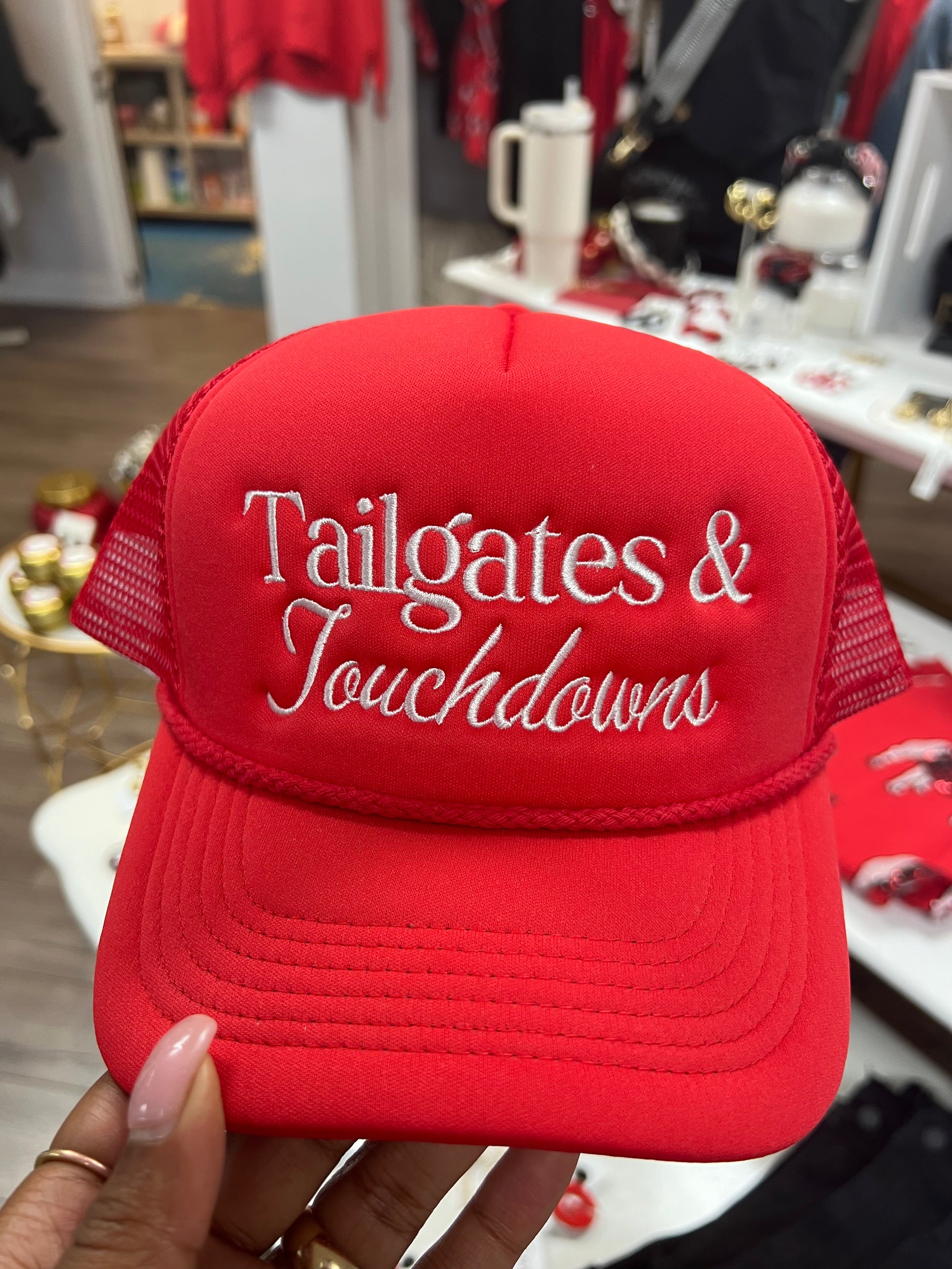 Get ready to score a touchdown in style with our Tailgates & Touchdowns Trucker Hat! Perfect for game day, this red hat is the ultimate accessory for any fan. Don't miss out on this must-have for your next tailgate!