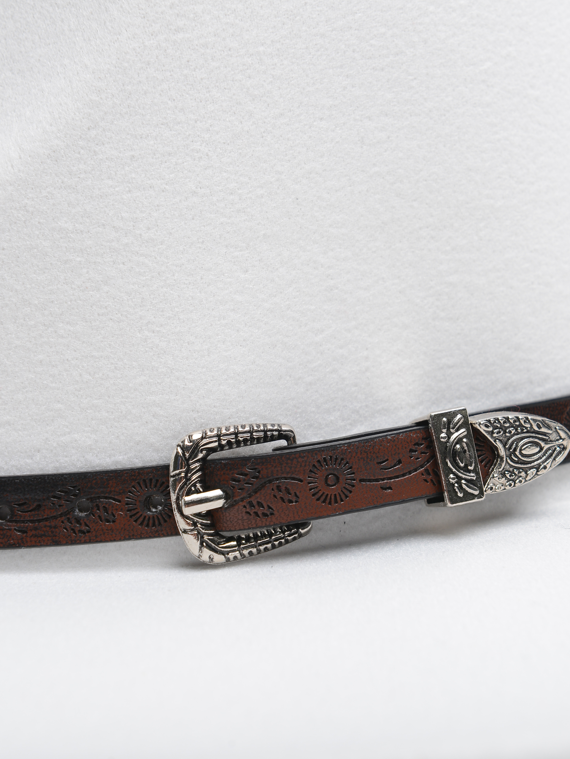 Crafted from vegan felt, this women's rancher hat makes a stylish and eco-friendly statement. The floral band adds a touch of femininity while the wide brim provides ample sun protection. Perfect for any outdoor adventure, and you can feel good knowing you're supporting sustainable fashion.
